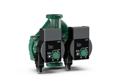 Rakor bağlantılı, blokaj akımına dayanaklı EC motorlu ve entegre elektronik güç regülasyonlu ıslak rotorlu ikiz sirkülasyon pompası.